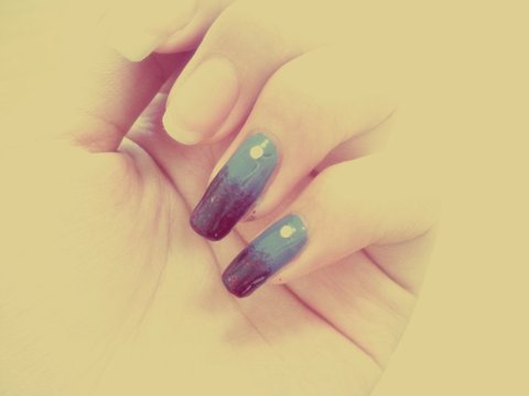 파란색을 먼저 바르고 빨간 글리터가 들어간 검정색으로 그라데이션을 줬어요! 저 하얀건 빛 때문에 잘안보이지만 큐빅이에요