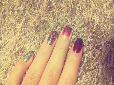 약지는 검정색을 바른다음 빨강 초록 금식 글리터가 들어간 매니큐어를 발라주었어요