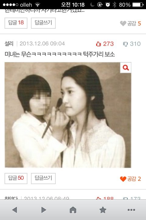 걍 안티들 다 들어오라고 올린판이네ㅋㅋㅋㅋ 지들은 뽀샵 떡칠한 셀카가 지얼굴인줄 착각하고 살면서 연예인들은 한창 뚱뚱하고 못생긴 중학생때 사진 졸사 들이밀고 못생겼대;; 태연이건 아이유건 수지건 손나은이건 윤아건 다 이뻐;; 열폭 작작해진짜
