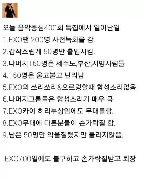 그리고 엑소팬분들 50명밖에들어가지 않은이유는 팬매니저 말도 잘안듣고 경호원들도 잘안따라줬다고 하더군요