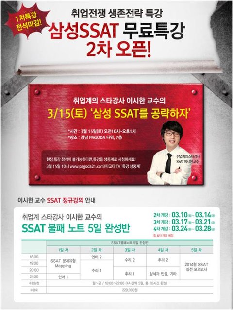 SSAT의 스타강사 이시한 교수라고 아시죠파고다에서 취업전쟁 생존전략 특강을 무료로 해주시는데요이번에 진행하는 무료특강은 전석 마감된 1차 무료특강에 이은 2차 삼성 SSAT 무료 특강이네요.