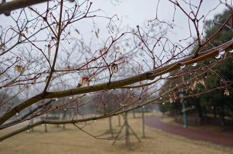 비가 내려서 나뭇가지에 물방울이 방울방울