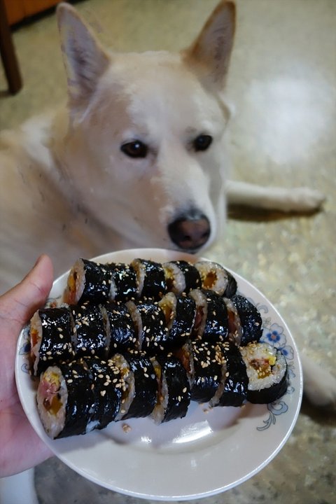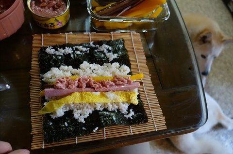 배고파서 김밥 말고 있어요.