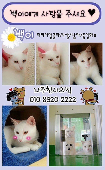 백이는 나주 위탁보호소에서 구조해온 아이입니다.