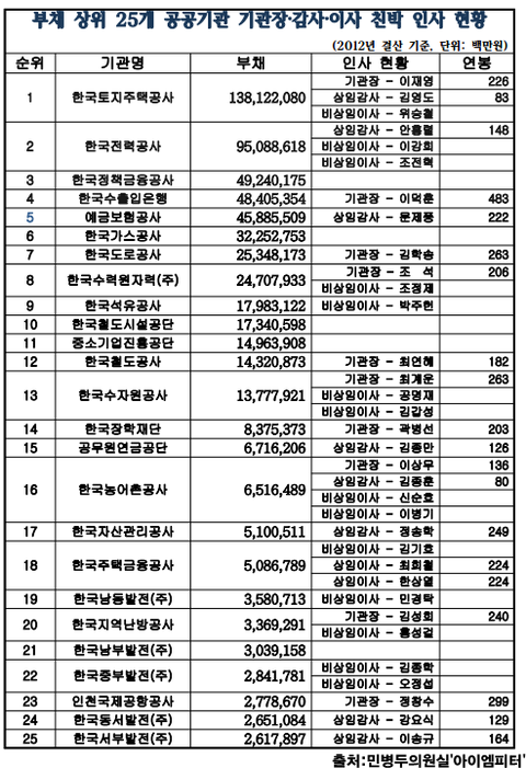공공기관 부채 1순위 '한국토지주택공사'의 감사 김영도는 박근혜 대선캠프 국민소통본부 특보단 총괄단장이었던 인물입니다. '한국전력공사' 안홍렬 감사는 17대 대선 박근혜 경선후보 서울선거대책본부장 출신입니다.