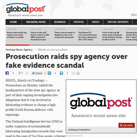특히 연합통신을 비롯한 한국일보, 한겨레 등이 영어뉴스로 긴급으로 국정원 압수수색 사실을 전하고 나서 외신들은 이 기사들을 받아 보도하고 있다. 글로벌 포스트는 10일 ‘Prosecution raids sy agency over fake evidence scandal-검찰, 증거조작 스캔들 건으로 국정원 압수수색’이라는 제목의 연합뉴스를 받아 보도했다. 이 기사는 ‘검찰은 세간의 주목을 받고 있는 한 탈북자를 간첩혐의로 고발하기 위해 증거를 조작하는 데에 연루됐다는 주장에 대해 진행 중인 수사의 일환으로 국정원 본부를 압수수색했다’고 전했다.