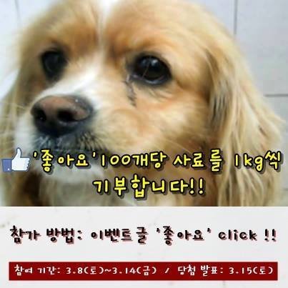 지금 페이스북 에서 좋아요 100개당 유기견에게 사료 1kg을 기부 하는 이벤트를 하고 있어요