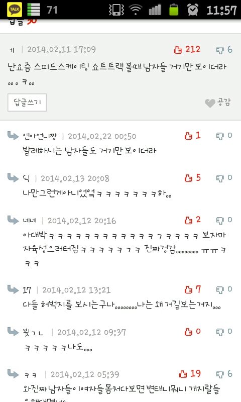 중간에 쉬려는데 의자가없길래 여자무리끼리 바닥에 몇명 저렇게 앉아서 쉬고있었는데, 남학생들이 건너편에서 흘끔흘끔했다고함. 봉사활동 끝나고 여학생들끼리 같은걸 느꼈는지 공감하며, 남자들 웃기다고 얘기하고 헤어졌음. 나중에 저런 자세 있는 인터넷 기사 봤을 때 '제군들 나와같은곳을보고있나?' 뭐 이런 음담패설이 많이 달려있더라 함.. 내가보기엔 위에 스케이팅선수 성기가지고 자기들끼리 좋다고 히히덕거린거나 좋다고 기사댓글 단 놈들이나 별 다를거 없어보이는데?? 어쨌든 이런 내용. (여기 원본내용과 달라서 조금 수정)