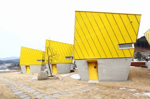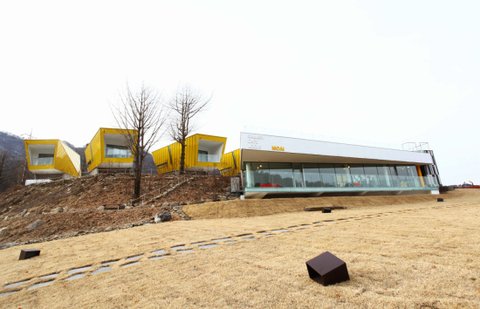 기단(갤러리카페)을 두르고, 그 토대 위에 6동의 노랑 매스를 심어 놓았다.