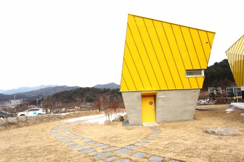 축령산의 풍요로운 햇살과 청아산의 관활한 풍경을 끌어안을 수 있게 하였다. 마을 초입의 완만한 지면으로부터 연계된 한옥의 시선이 가려지지 않도록 엇 쓸어놓은 노랑 매스는 자연에 기댄 피조물의 어중띤 관계가 아닌,