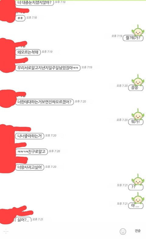 나고1임 우리반에 머리 바가지머리로 짜른여자애가있는데 교복도바지입고 남자처럼하고다니는애가있음 근데 걔가 개학첫날부터 나 계속 뚫어져라쳐다보고 쉬는시간에 내 옆자리로와서 말걸어주고 책도 가져다주고 처음엔 나랑친해지고싶어서 그런거구나 생각하고 나도같이 잘해줬음 얘가 갑자기 우리번호교환하자 이래서 알겠다하고 번호교환하고 연락하고그랬음 근데 이때부터 좀 이상했음.. 카톡하는데 무슨 남친이랑톡하는줄ㅋㅋㅋㅋㅋㅋ카톡답느리면전화해서 왜톡답안하냐고 걱정된다그러고 자기전에 항상 사랑한다고 톡하고;좀부담스럽게 대하는거임 얘가나좋아하나?착각할정도로ㅋㅋㅋㅋ근데착각이아니였음 ..얘가방금톡으로 고백함ㅋㅋㅋㅋㅋㅋ캡쳐함