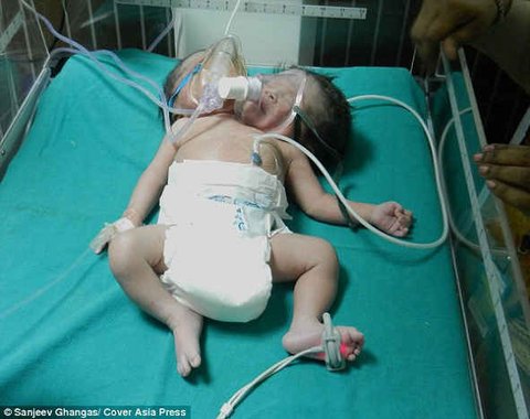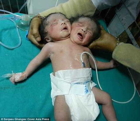 제왕절개로 태어난 이 아기들은 두개의 머리로 하나의 몸을 공유중이다.