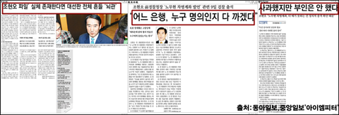 동아일보는 <어느 은행, 누구 명의인지 다 까겠다>는 제목을 통해 진짜로 은행에 비자금이 있는 것처럼 보도했습니다. 중앙일보는 <사과했지만, 부인은 안 했다>를 통해 조현오의 주장이 결코 거짓이 아니라는 식으로 사람들에게 세뇌를 시키기도 했습니다.