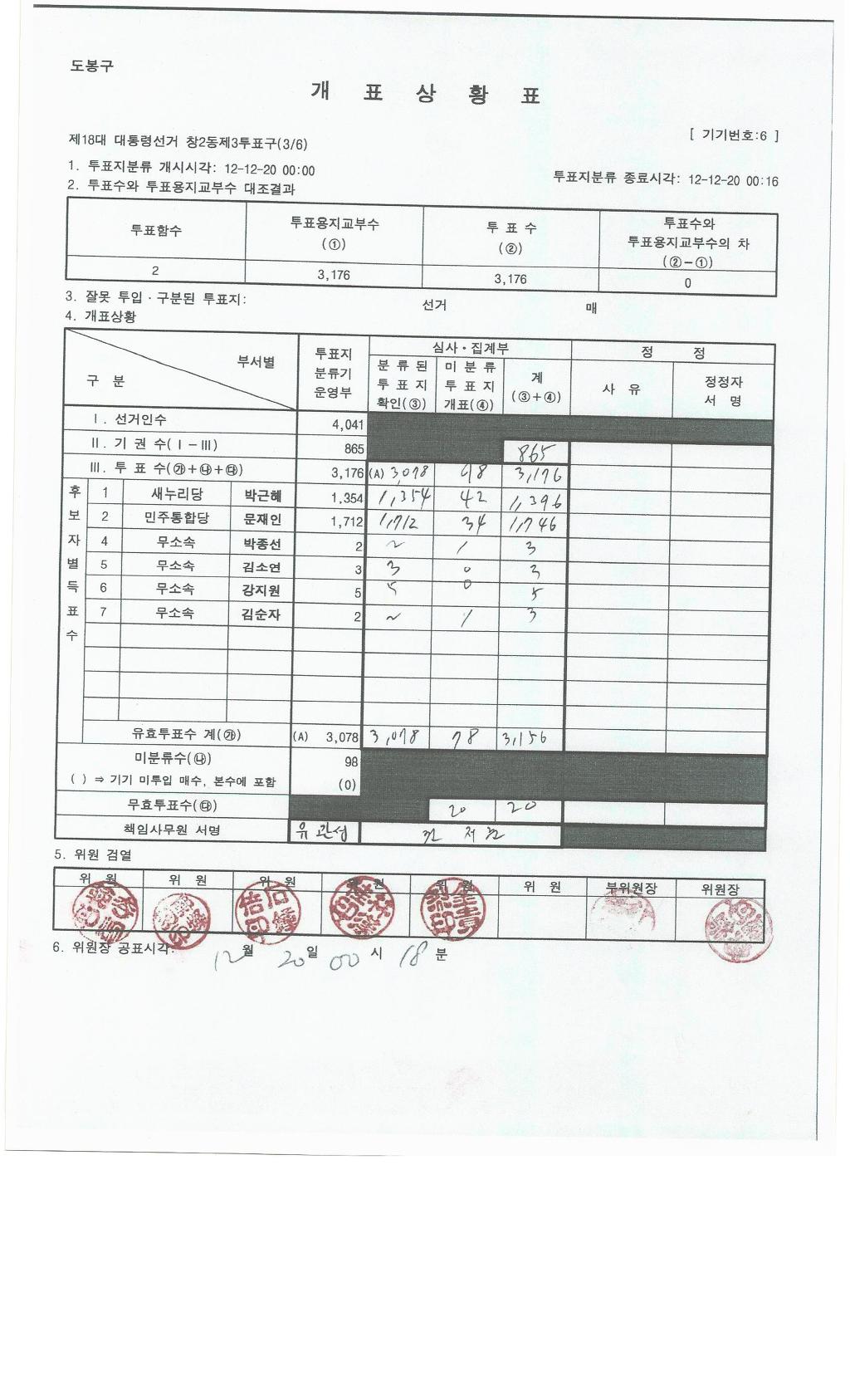 그런데, 3,176표를 2분만에 수개표를 하는 것은 물리적으로 불가능하다.