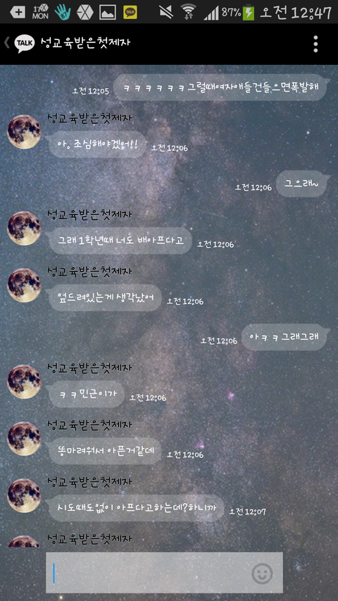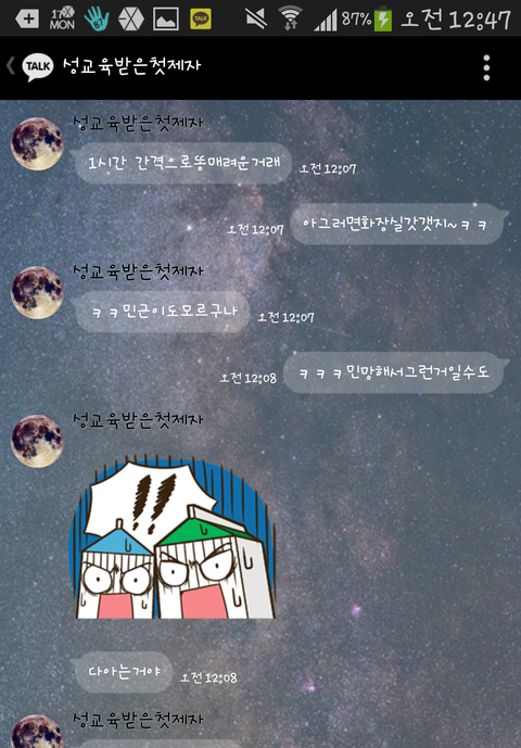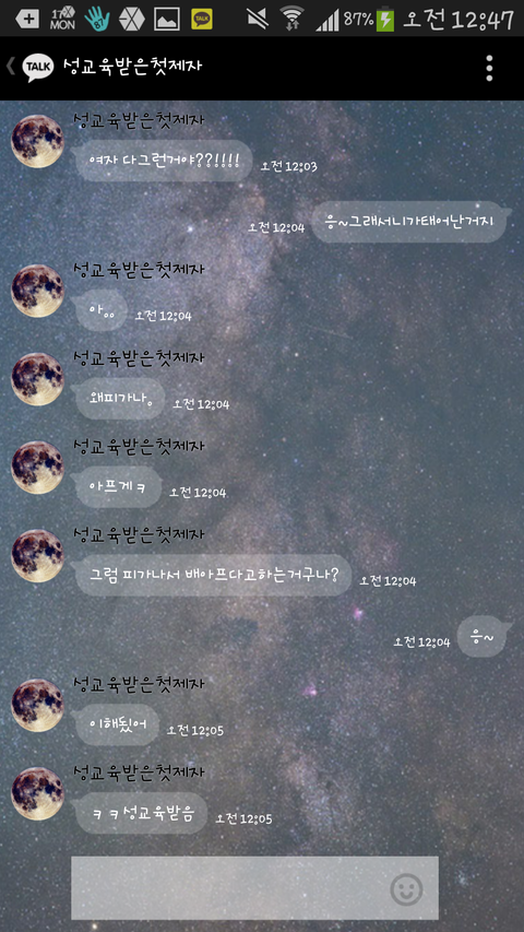 지금은아니지만 작년중1때 저랑같은반하면서가정시간에다배운건대별로친하지도않는애가저렇게그것도이야심한밤애저래서당황탓죠하지만그건창피한개아니니깐당당하게돌직구로날렷죠ㅋㅋㅋ