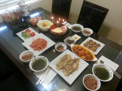 닭볽음탕, 계란찜, 동그랑땡, 회무침, 생선구이, 미역국 등등..