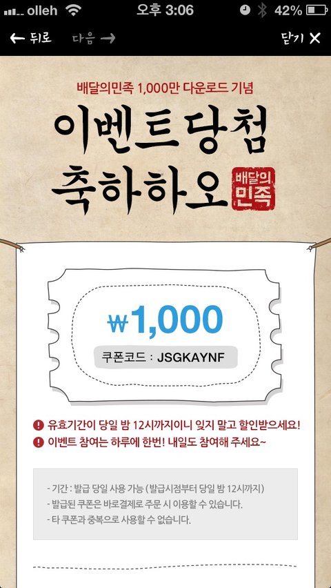 생각날때마다 배달의민족 어플 한번씩 확인만 해주면.. 이런 기세라면 만원 나올것도 같은데;