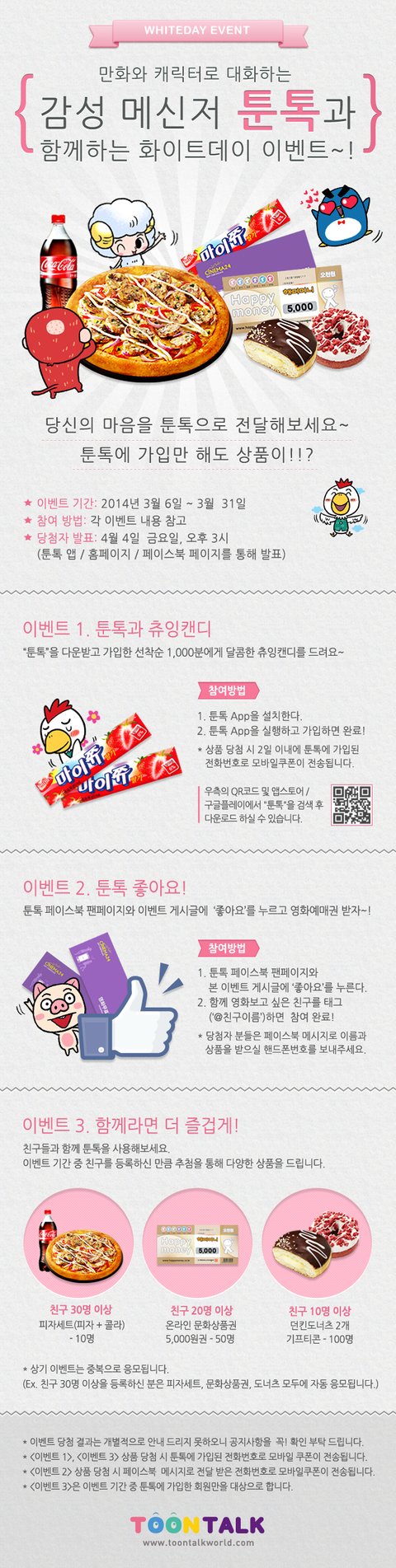 안녕하세요~ 캐릭터와 만화로 대화하는 모바일 메신저앱 "툰톡"에서 화이트데이 이벤트를 진행중입니다.(화이트데이는 지났지만... 이벤트는 3월 말까지 진행합니다~!!) 피자세트, 문화상품권, 영화예매권 등 앱을 설치하거나 페이스북을 통해서 간단하게 참여 할 수 있으니 많이 참여해주세요~~! 툰톡 페이스북 팬페이지:
