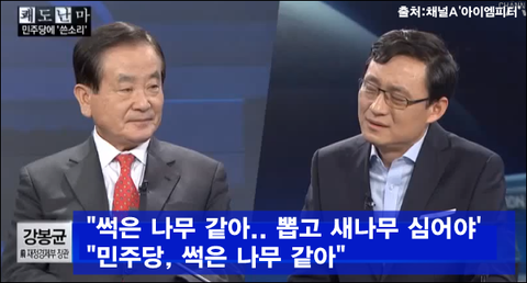2월 11일 <채널A 쾌도난마>에 강봉균 전 재경부 장관이 패널로 출연했습니다. 당시 화면에는 <강봉균 전 재정경제부 장관 : “썩은 나무 같아...뽑고 새나무 심어야”> <“민주당, 썩은 나무 같아”>라는 자막이 나왔습니다.