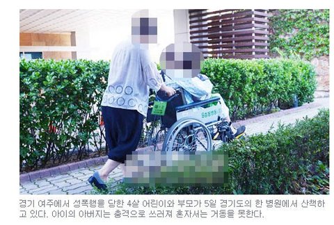 지난 7월 어느 날의 일이다. 경기 여주에 사는 ㄱ씨(43)의 막내딸은 태어난 지 40개월 만에 믿기지 않는 일을 당했다. 이웃에 사는 50대 남성이 집 근처 수돗가에서 물놀이를 하던 ㄱ씨의 딸을 데려가 성폭행한 것이다. 운전일을 하는 아빠 ㄱ씨와 피자가게를 하는 엄마 ㄴ씨(40)는 밤늦게까지 일을 하느라 아이 곁을 지키지 못했다.