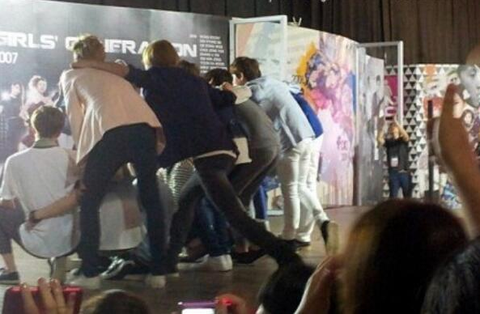 1. 멤버들과 자연스럽게 키를 맞추려 긴 다리를 뒤로 불편하게 뻗는 찬열이