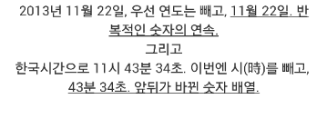 네, 지금 이 순간 2013년 11월 22일 금요일 한국시간으로 11시 43분 34초! 이 순간 즐기고, 잊지않고 항상 열심히 하는 엑소 되겠습니다.