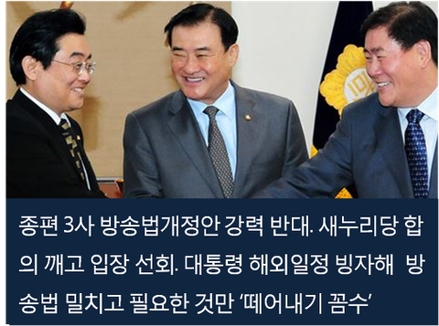 현재 언론환경이 공정하고 객관적이라며 여야 합의한 방송법개정안을 보이콧하는 새누리당. 대통령 해외 회의 참석이라는 기회를 활용해 방송법개정안과 물려있는 원자력방호방재법을 떼어내려 한다. 종편을 지켜내기 위해서다. 방송법 개정 필요성에 대해서는 “방송환경이 공정하다”는 궤변으로 빠져 나가려 한다.