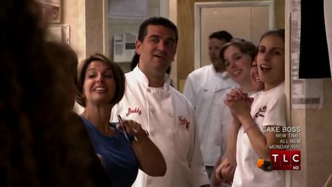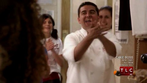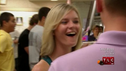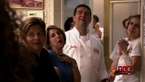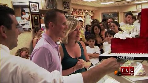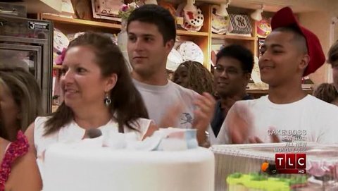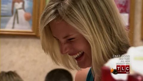 여자가 마침내 케잌을 보고 깜짝 놀라자