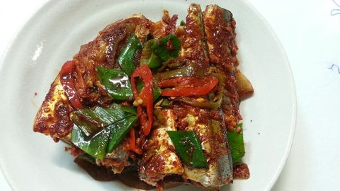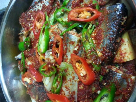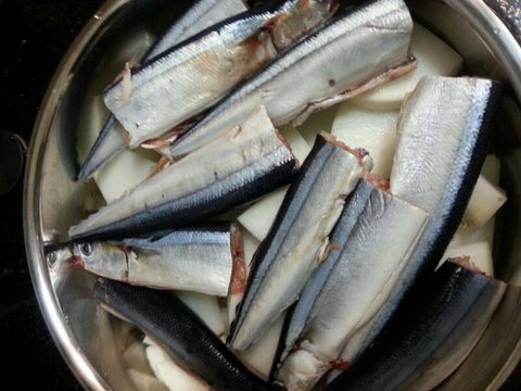 냄비에 무를 먼저 깔고 꽁치를 넣고 홍고추