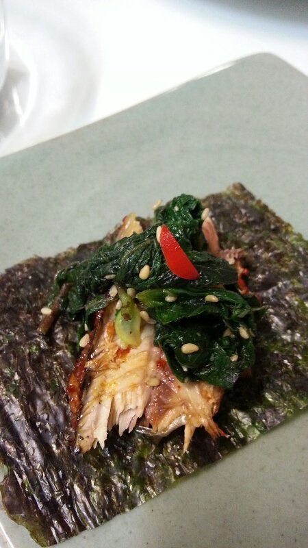 김 위에 밥을 올리고 깻잎을 올려서