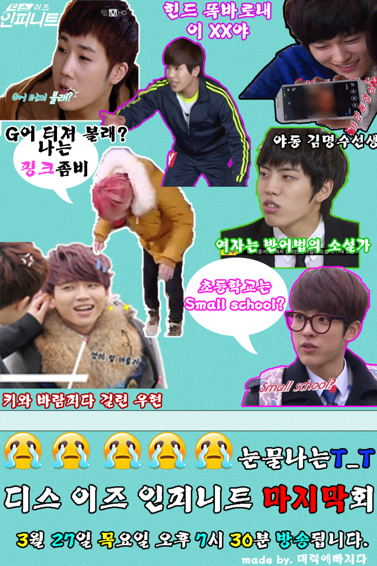 7주동안 열심히 달려온 디스 이즈 인피니트가 드디어 마지막회를 마지하게 됬습니다T_T 마지막도 여전히 DISS가 계속되니 마지막회까지 본방사수!합시다그리고 디스이즈인피니트를 아직 못보셨다!! 하시는분들은 10분만에 디스이즈인피니트 정복하기! 동영상보시는거 추천드립니다♥