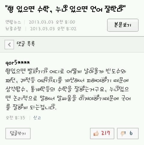 오~ 일리가 있는 말인데?? ㅎㅎ 그래서 난 둘다 못 하는거구나.. 참고로 무남독녀임..ㅜㅜ