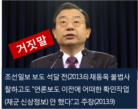 하지만 청와대 총무비서관실 행정관이 조선일보 보도 석달 전 혼외자식으로 지목된 채군의 가족관계등록부를 조회한 사실이 알려졌다. 그러자 청와대는 “조오영 행정관의 개인적 일탈일 뿐”이라고 둘러댔다. 언론보도 이전에 어떠한 불법사찰도 없었다는 청와대의 주장은 거짓말이었던 것이다.