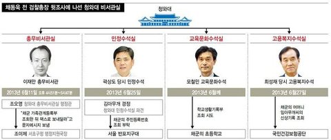 형사 3부는 채 전 총장을 찍어내기 위해 청와대가 총동원됐다는 사실을 밝혀냈다. 원세훈·김용판 두 사람이 선거법 위반으로 기소된 시점인 지난해 6월 전후로 총무비서관실뿐 아니라 민정수석실, 교육문화수석실, 고용복지수석실까지 채군 신상정보를 입수하기 위해 분주하게 움직인 사실이 드러난 것이다.