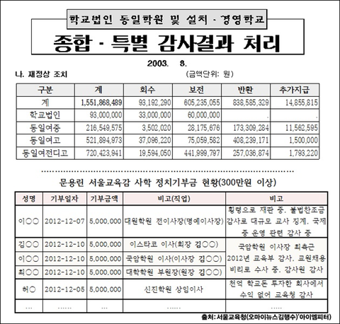 2003년 서울시교육청 감사결과 비리가 밝혀진 동일학원을 비롯한 사학재단 관계자들은 문용린 교육감에게 수천만 원의 정치기부금을 냈습니다.