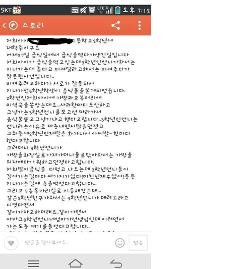 그리곤 몇명언니는 다가와서 무슨일이냐고 너가 사과하라고 어떻게 3학년언니한테 반말을 하냐고 그런식의훈계를 받고 욕도 먹고 그랬어요