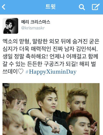축하글을 남겨줬었다는 거슬... 나웅녀 트위터를 돌아댕기다가 발견했다!!ㅋㅋ슈밍 생일날 중국 바이두 크리스개인바에서도 민석이 사진이랑 같이 축하해줬던글을 어떤 웅녀가 올려줘서 너무 고마웠었는데.....ㅠㅠ동이 터오는 아침에 받은 훈훈한 기분은 웅녀들에게도 전해주고 싶었엉~우리도 다가오는 멤버들 생일 축하 많이 해주쟈~!!! 짧은 축하글이지만 다가오는 기쁨이, 후눈함이 이루말할 수 없는거 같네~