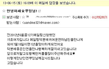 제목 : 성별/나이/지역 메일팅 신청합니다!(ex) 여자/20/경기 메일팅 신청합니다!)