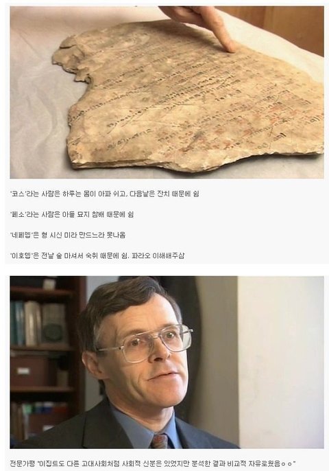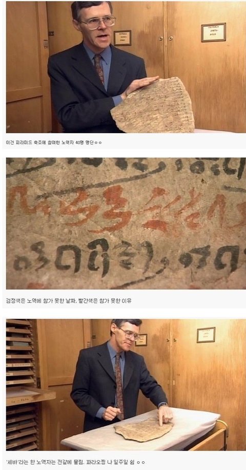 피라미드 노동자의 처우는 그동안의 생각과는 달리 그다지 열악하지 않았다. 노동자들은 아프거나 무슨일이 있을 때 담당자에게 말하고 휴가를 얻을 수 있었고 심지어 채찍으로 맞았다는 증거도 없다고 한다. 그러나 오늘날 피라미드의 이미지가 이렇게 된 것은 구약성경의 모세의 이야기에서 나온 기록을 그대로 여과없이 따왔기 때문이라고 한다....