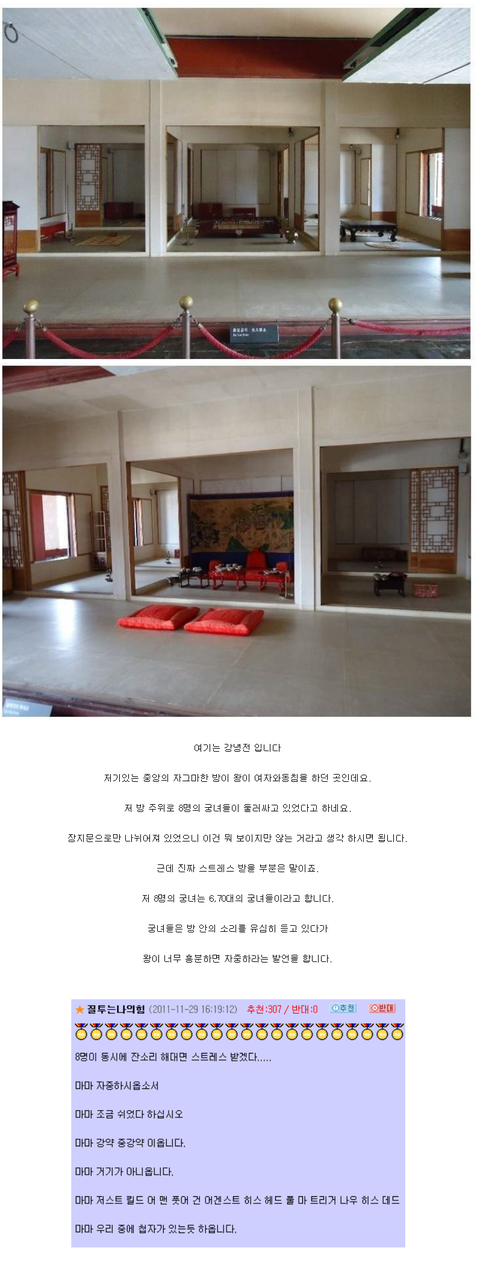 궁녀만 있는게 아니고 어의도 침 들고 대기타고 있다고 무슨 다큐에 나왔던거같음.. 그리고 닭도 한마리 데리고 있다고 함.. 왕이 혼절하거나 하는 등의 위급상황시 침을 놓거나 닭피를 먹게 한다나...
