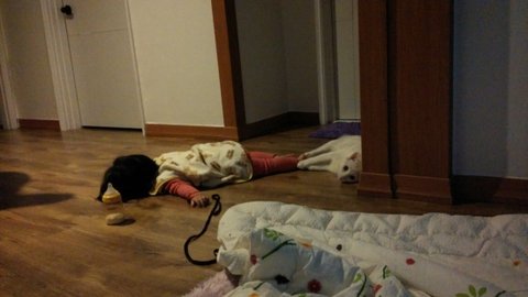 빈이없는 마루는 외로워 ㅠㅠ ( 빈이가 자는 시간이랍니다.. 빈이의 어린이집가방에 외로움을 달래는중이네요 ^^;;)