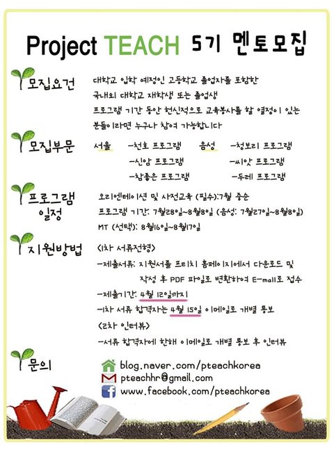 2014년 7월 28일부터 8월 8일 까지 Project TEACH 여름 프로그램이 진행 됩니다. blog.naver.com/pteachkorea 에 지금 동안 진행 했던 프로그램 세부 설명, 프로그램 별 특성, 멘토 사전 교육과 프로그램 이후의 혜택 등이 자세하게 설명되어 있습니다. Project TEACH 공식 블로그를 통해 참고하시고 Project TEACH 5기 멘토 모집에 참여해주시면 감사하겠습니다. 3월 23일부터 시작되는 5기 멘토 모집 관련 문의는 blog.naver.com/pteachkorea, facebook.com/pteachkorea, pteachhr@gmail.com 으로 가능합니다. 한국의 교육과 사회적 문제에 관심이 있으신 분들의 많은 참여 부탁 드립니다.