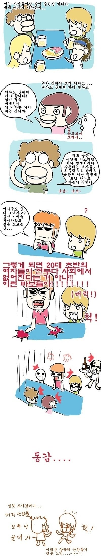 뭐, 얼굴 못생기고 상사 고문하는 성격 더러운 것들은 군대 보내버리고 싶은데, 내 딸이나 여친, 여동생, 누나가 군대가야 한다고 생각하면 보내고 싶지 않거든.