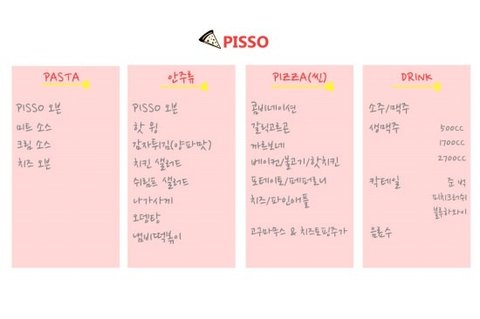 PISSO를 찾으시는 손님들을 위해 친절하게 마련된 메뉴들.