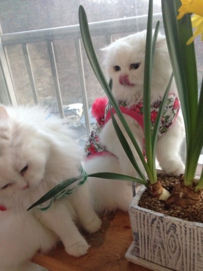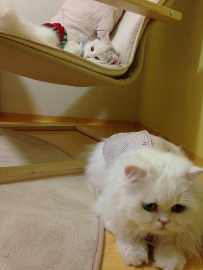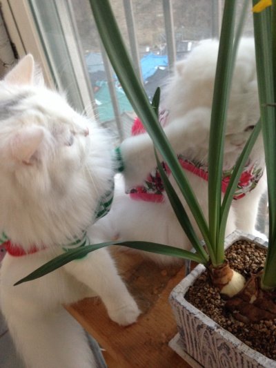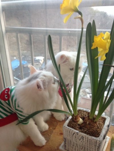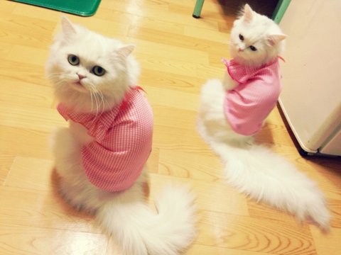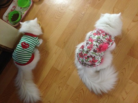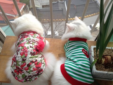 새옷입은 양이랑 미양이가 간식달라고 부엌에서 기다리는 중이에요