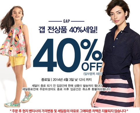 현재는 갭 전상품에 대해 40% 할인이 진행되고 있네요.