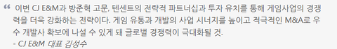 ‘텐센트(Tencent)’로부터5억 달러의 외자를 유치했다고 지난 26일 발표했습니다. CJ E&M은 이번 외자유치가 CJ E&M넷마블과 기존 CJ게임즈 통합법인(가칭 CJ넷마블) 유상증자에 텐센트가 참여하는 방식을 통해 이뤄진다고 설명했는데요. 이를 위해 CJ E&M은 게임사업부문인 ‘넷마블’을 물적 분할해 CJ게임즈와 통합시킬 예정이라고 합니다.