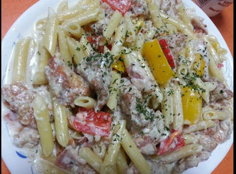 크림소스를 버무린 치킨에다가.......파스타면까지!