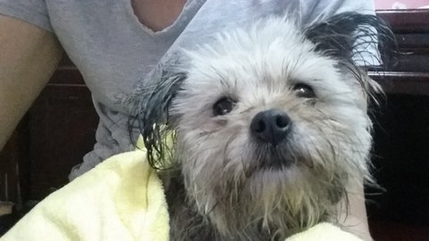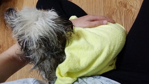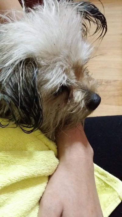 몸에 샴푸 묻은곳만 물로 살살 닦아내고 수건으로 감쌌습니다.