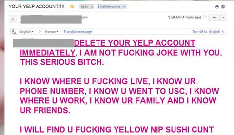 요약하자면 yelp 어카운트를 당장 지워라 이 호로년아 안 없애면 죽여버린다 나 너 어디 사는지도 알고 있고 어디서 일하는지도 알고 있고 너네 가족도 알고 있고 전화번호 주소 다 알고 있다. 너 강간하기 전에 이거 지워버려라 이 동양 스시 년아 어쩌구 저쩌구